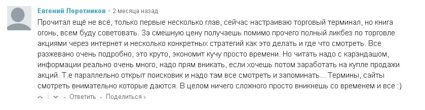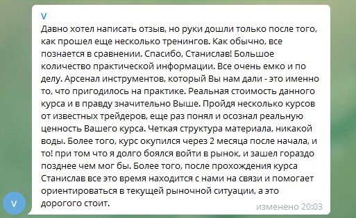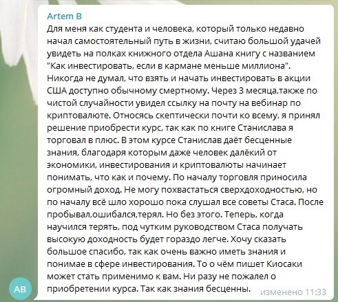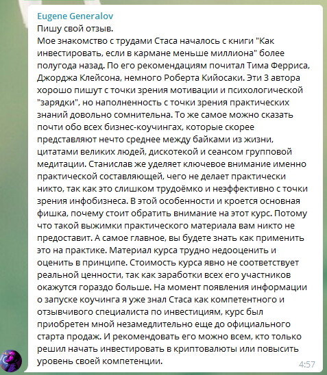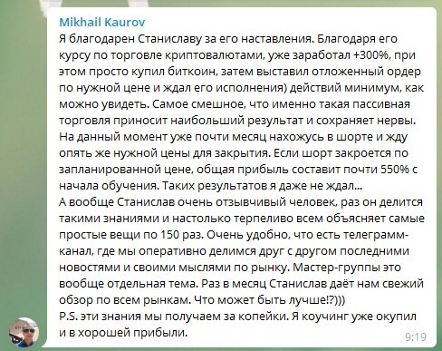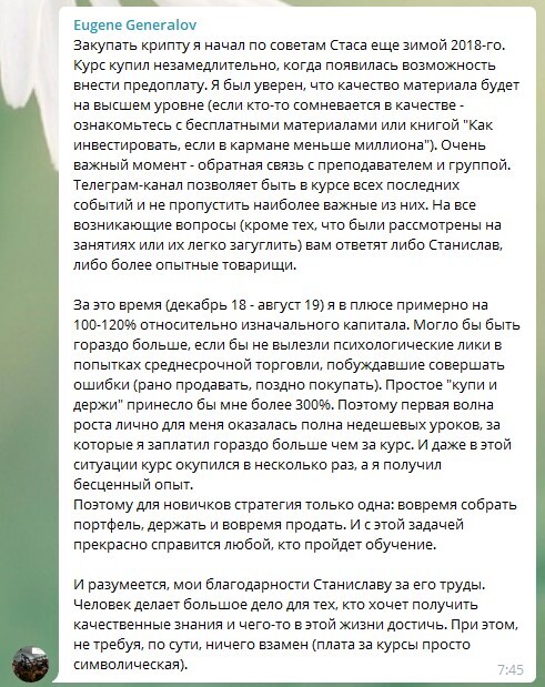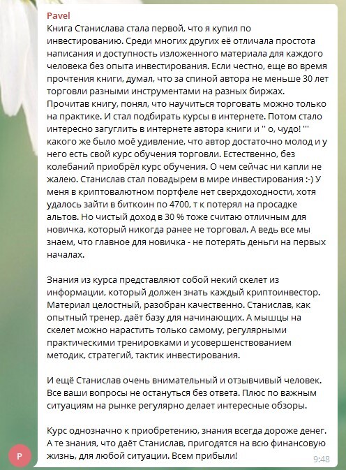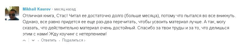 Хороший продукт - это сплав титанических знаний в обязательном порядке проверенных на личном опыте и обкатанных в боевых условиях. Вы сами можете убедиться в том, что без крупных рекламных компаний книга Станислава и его курсы распространяются среди тех, кто в этом действительно нуждается, а значит попадает в итоге именно в те руки, для которых они и были предназначены.