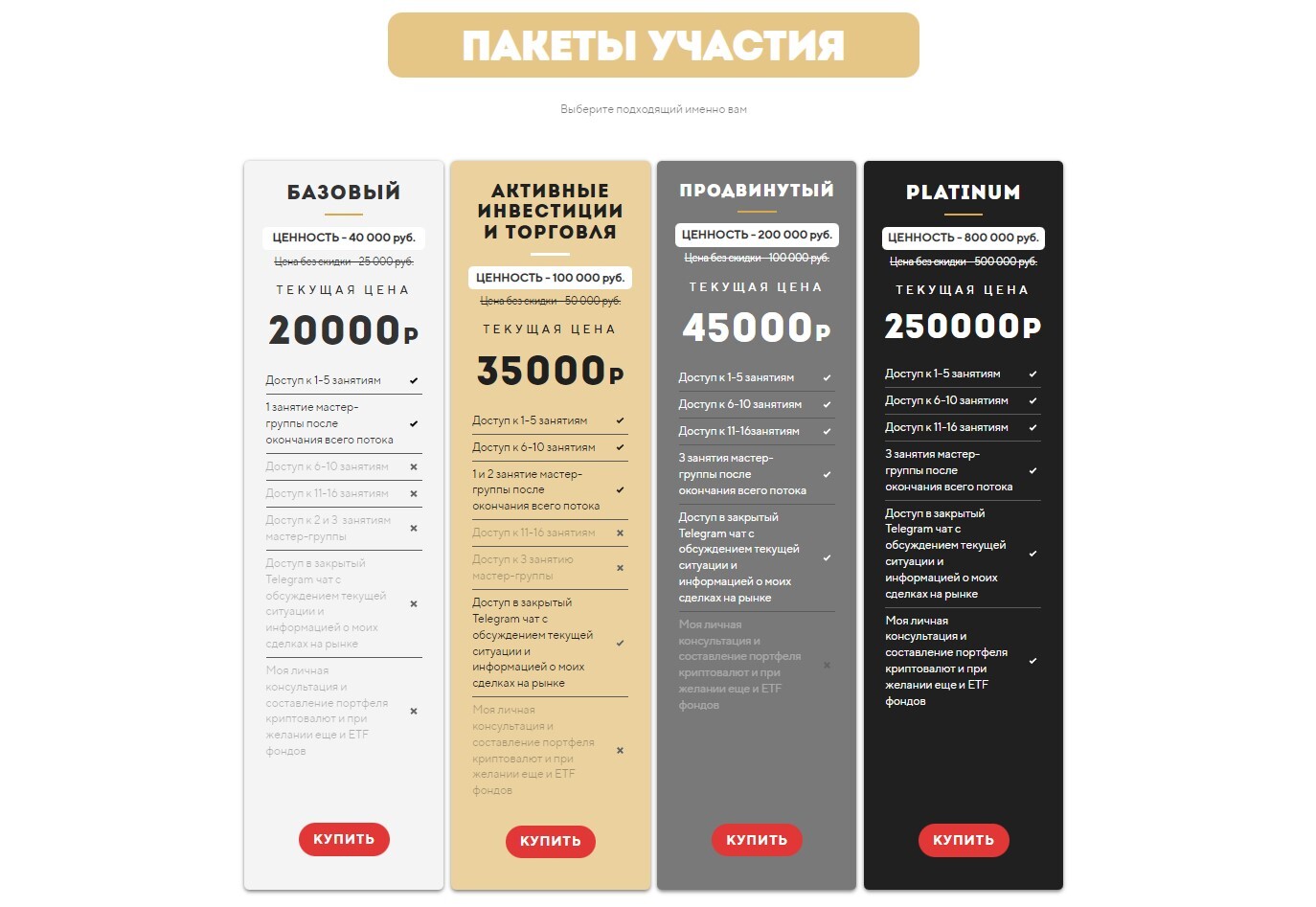 Выбери подходящий пакет участия.