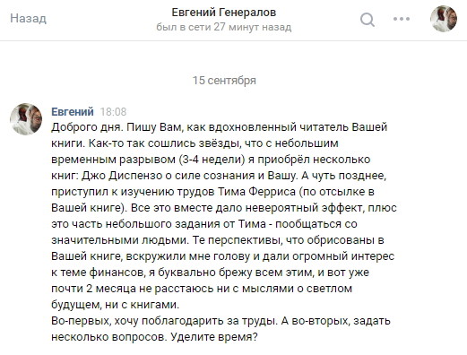 Все дело в том, что я действительно даю реальный и полезный контент и не занимаюсь агрессивной продажей и втюхиванием своего коучинга всем подряд вне зависимости от того нужен ли он вам или нет, как делают большинство инфобизнесменов.