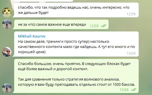 Для всех участников, кроме "Базового" пакета, создается отдельный телеграмм канал, на котором вы можете обсуждать свои идеи и стратегии и получить обратную связь от меня